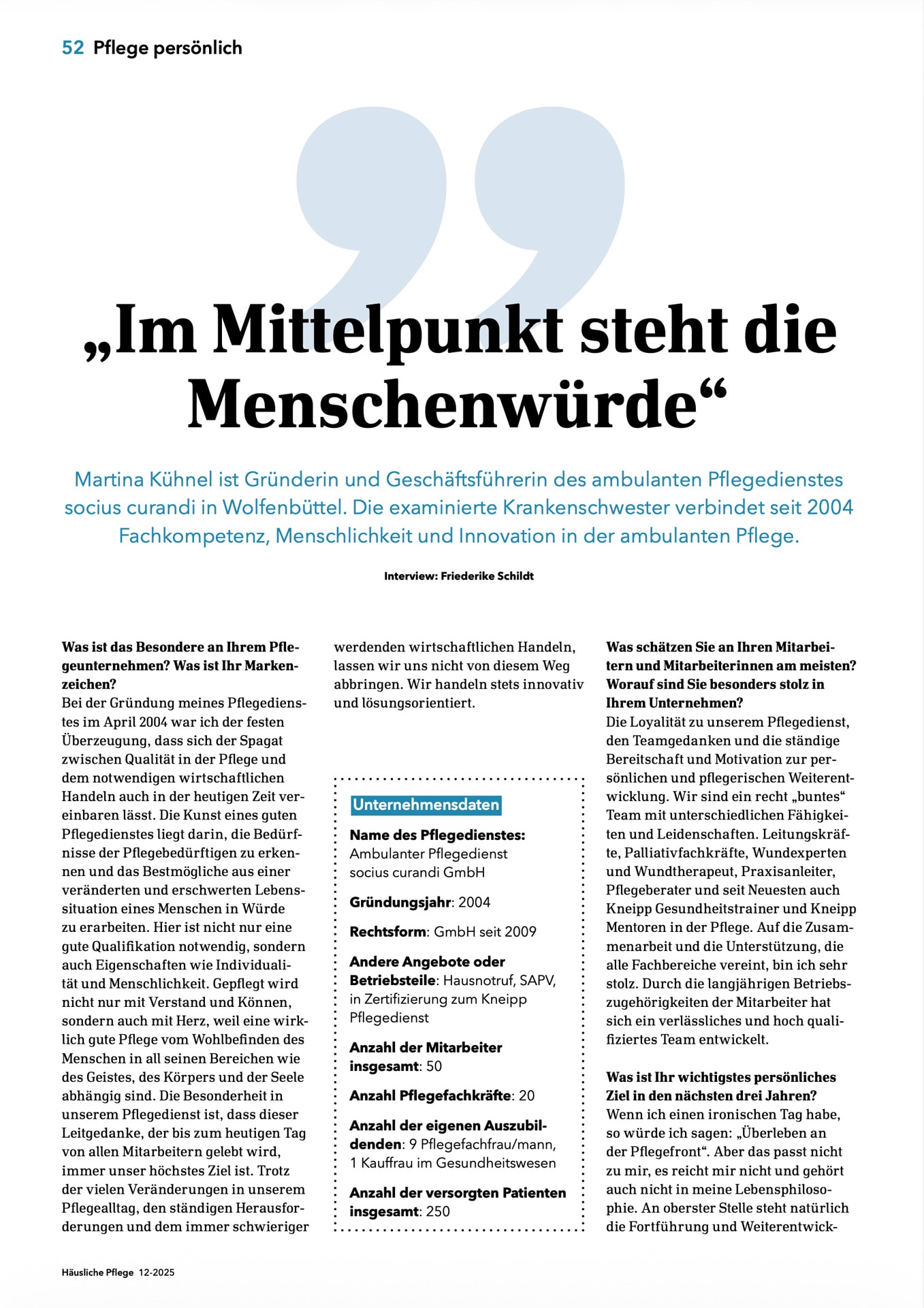 Martina Kühnel ist Gründerin und Geschäftsführerin des ambulanten Pflegedienstes socius curandi in Wolfenbüttel. Die examinierte Krankenschwester verbindet seit 2004 Fachkompetenz, Menschlichkeit und Innovation in der ambulanten Pflege.